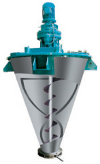 由擺線針輪減速機連接中心螺桿及外層螺帶以相同轉速轉動。工作時,中心螺桿將混合物料由底部提升到頂部,同時線速度較大的外部螺帶將物料由下而上沿錐形筒壁盤提升,二種運動在離心力作用下又將物料沿切線方向拋向空間,物料產生強烈的對流剪切、擴散,從而達到快速混合的目的。(螺桿也可做成反向螺桿)。