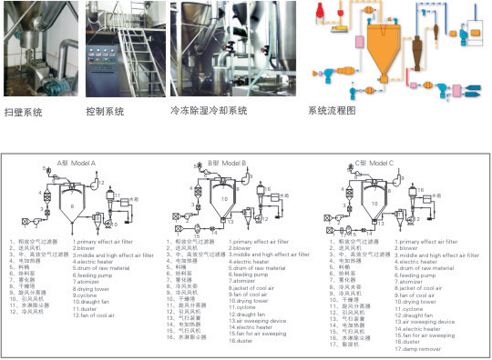 該機采用全封閉形式,所有部件均采用不銹鋼制造,配有多級凈化裝置,過濾后的空氣達十萬級要求 。簡體與頂部裝有冷壁裝置,使壁溫<80℃,物料在壁上停留也不焦化變質現象,大大增加了收粉率(達95%以上),而且不會產生混藥現象和粘壁現象。