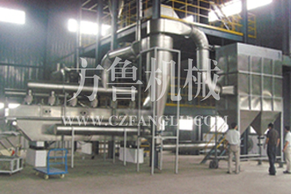 雞精有一定的粘性易粘在干燥機床面上造成干燥無法進行。我公司為解決這一問題采取了多種措施。雞精擠壓造粒成型后,表面水份較高,我公司生產的流化床第一段采取了低溫大風量預干燥,使雞精表面水份迅速降低,同時表面粘度也有所降低。流化床第二段采取中溫大風量干燥,以進一步降低雞精表面水份。流化床第三段采取中溫常規(guī)風量干燥,使雞精在流化床內有充分的停留時間以得到有效的干燥。流化床第四段采取大風量冷卻,便于雞精在篩粉后能直接包裝。總之,為了滿足雞精在不同階段的工藝要求,床面的開孔率及開孔方向以及風機選型均有相應的設計規(guī)范。