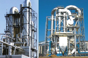 底部強(qiáng)化器設(shè)計獨(dú)特,攪拌齒為菱形,其流線性能使風(fēng)阻達(dá)到最小,設(shè)置在圓錐形料斗內(nèi),分動刀和定刀,粉碎效果顯著,使下落的結(jié)塊物料迅速粉碎為適合氣流干燥的粉粒料,攪拌的另一個主要作用是分散物料,加大了與料斗下面進(jìn)來的高速熱風(fēng)的接觸面積,于是料斗區(qū)形成了一個強(qiáng)烈傳熱傳質(zhì)的流化床,大部分濕分在料斗區(qū)被干燥。隨著干燥的進(jìn)行,變輕變細(xì)的干料受氣流作用明顯,與氣流一起上升并進(jìn)一步干燥,最后從干燥塔頂部出來進(jìn)入物料收集系統(tǒng)。